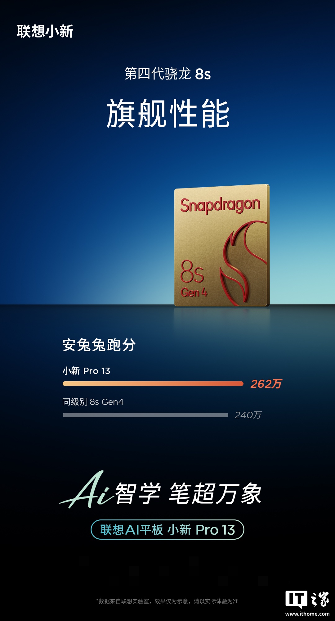 IT之家 3 月 9 日消息,联想小新今日宣布,联想 AI 平板小新 Pro13 将搭载第四代骁龙 8s 处理器,安兔兔跑分超 262 万,宣称高于同级别 8s Gen4 处理器设备(240 万)。