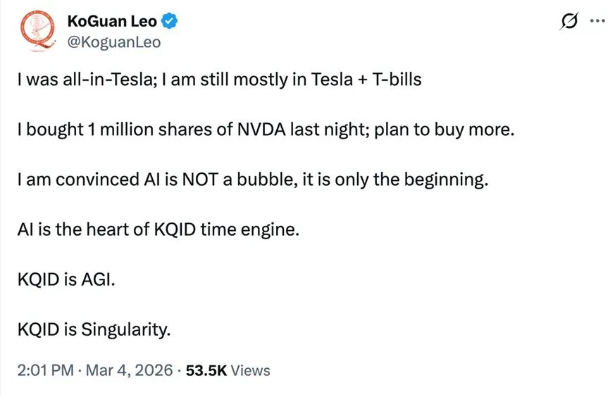 2026 年 3 月 4 日,华裔富豪廖凯原( Leo KoGuan )在社交平台 X 上宣布,已买入 100 万股英伟达股票,耗资约 1.8 亿美元,并计划继续增持。