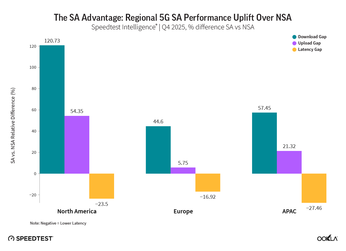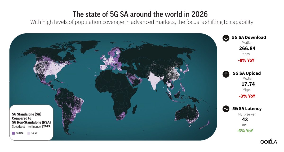 C114讯 3月10日消息(颜翊)分析机构ookla近日发文称,2026 年,移动网络演进正式告别“唯速度论”,转向以时延、韧性及现实表现为核心的新阶段。5G 独立组网(SA)作为这一转型的基石,虽在全球范围内持续扩展,但区域间的鸿沟正显著拉大,而如何将技术优势转化为商业回报,成为运营商面临的首要考题。