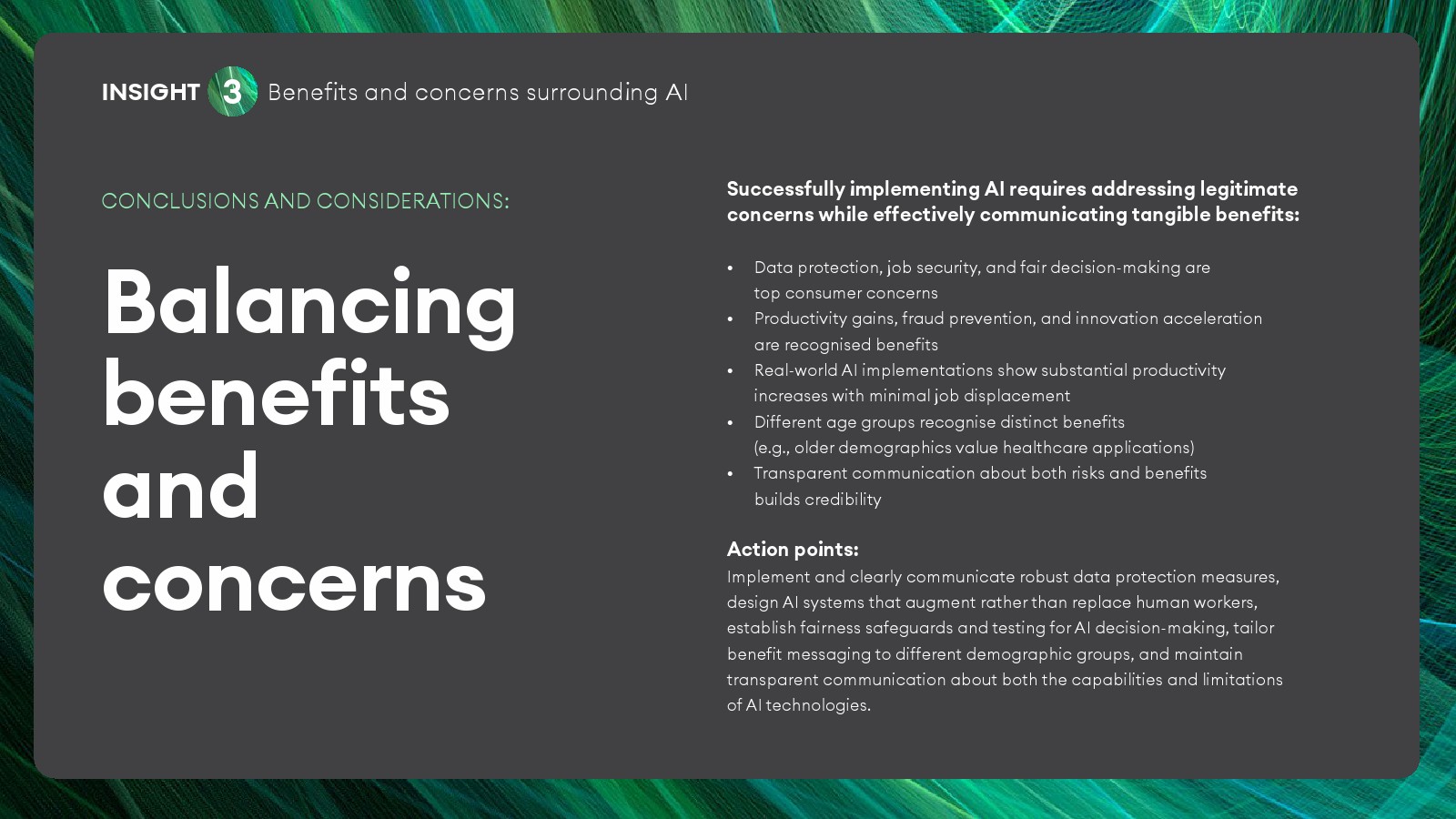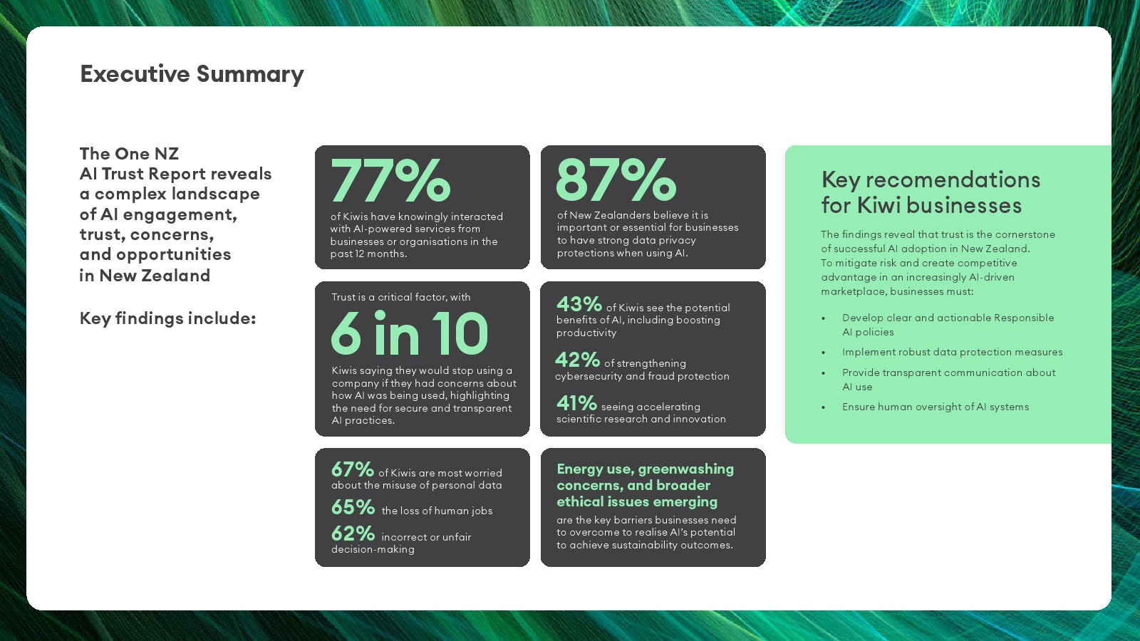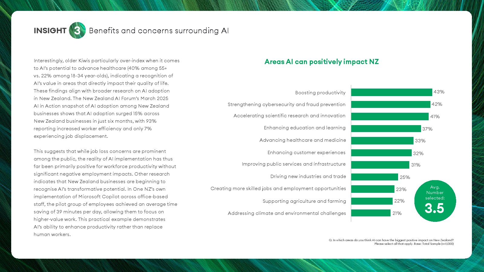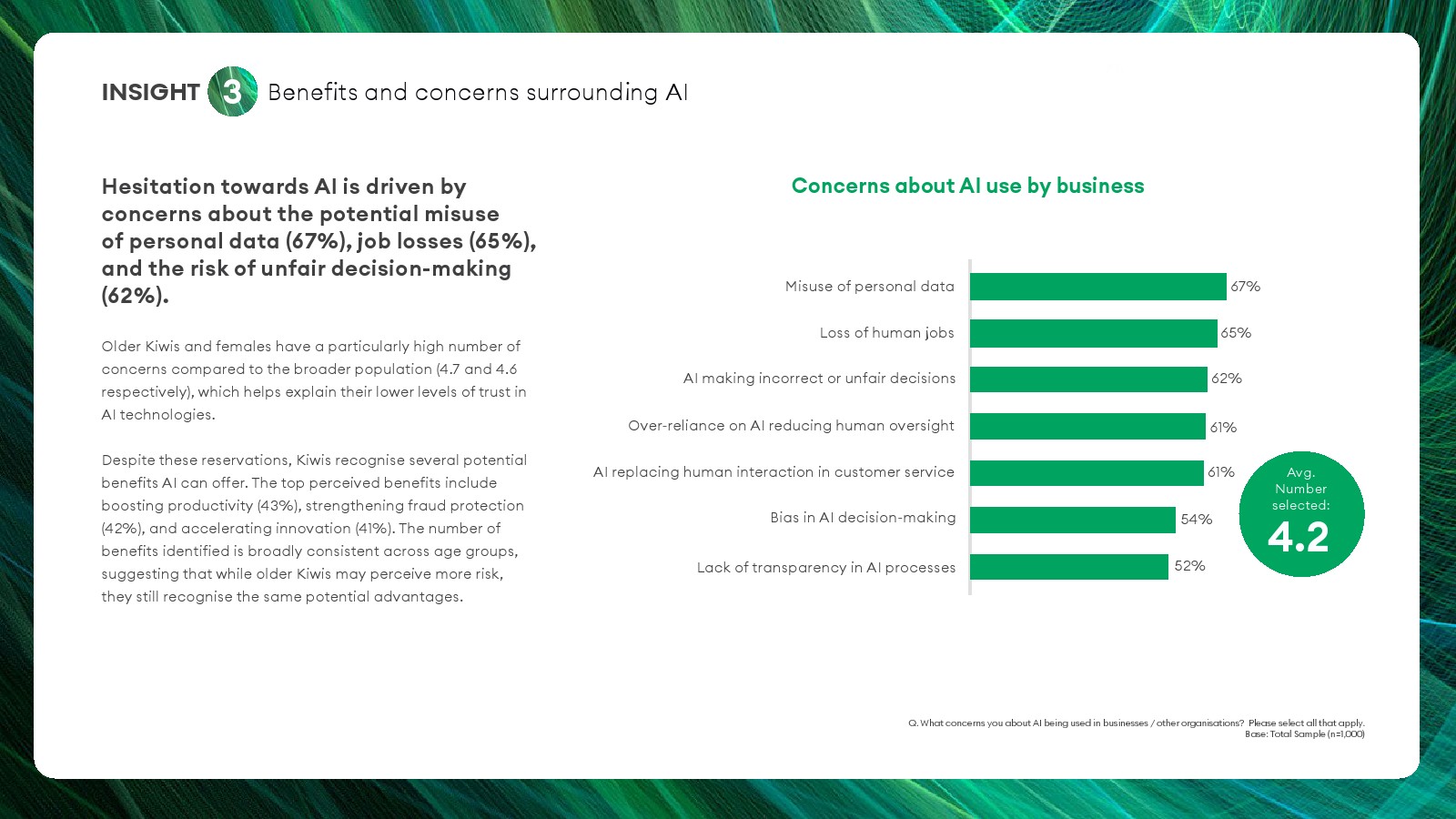 尽管使用率上升,但公众对AI的核心担忧依然集中在三大风险。67%的受访者担心个人数据被滥用,65%担心AI导致就业岗位减少,62%担忧算法产生错误或不公平决策。此外61%的受访者担心企业过度依赖AI削弱人工监督。与此同时,新西兰公众仍认可AI潜在价值,其中43%认为AI可提升生产效率,42%认为有助于网络安全与反欺诈,41%认为可推动科研创新。这种“机会与风险并存”的认知构成当前AI舆论的典型结构。