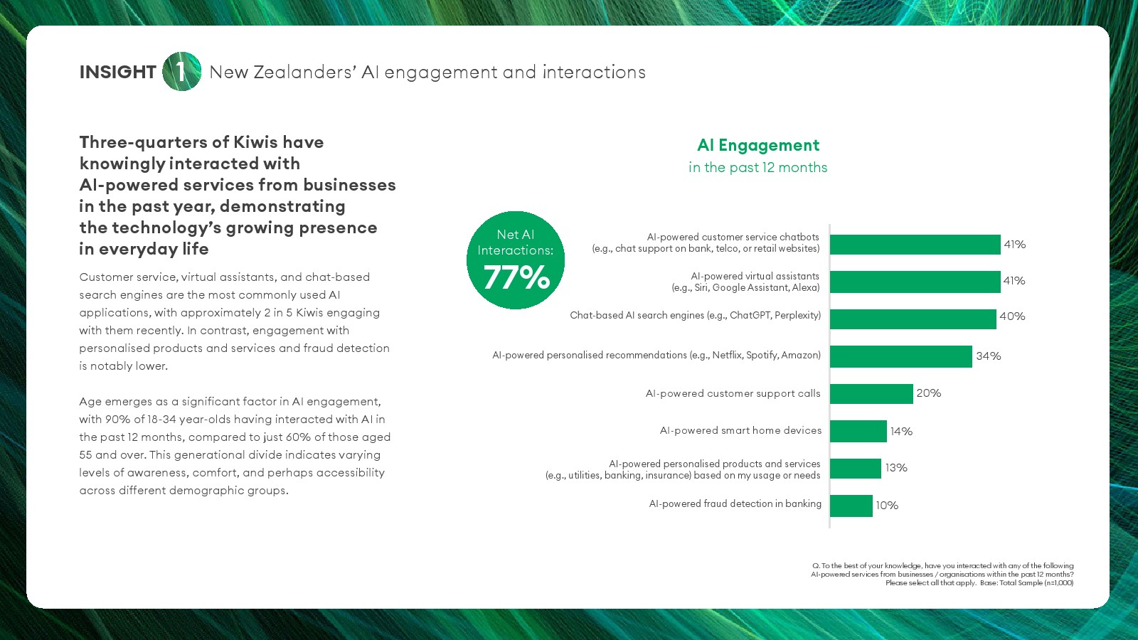 数据显示,人工智能已快速渗透新西兰社会,但公众信任仍明显滞后。调查显示,过去12个月中有77%的新西兰人曾主动使用过企业提供的AI服务,常见场景包括客服聊天机器人、虚拟助手和AI搜索工具,使用比例分别约为41%、41%和40%。年轻群体参与度明显更高,18至34岁人群中AI接触率达90%,而55岁以上群体仅为60%。这表明AI普及呈现明显的代际差异,技术认知与接受度仍受年龄结构影响。