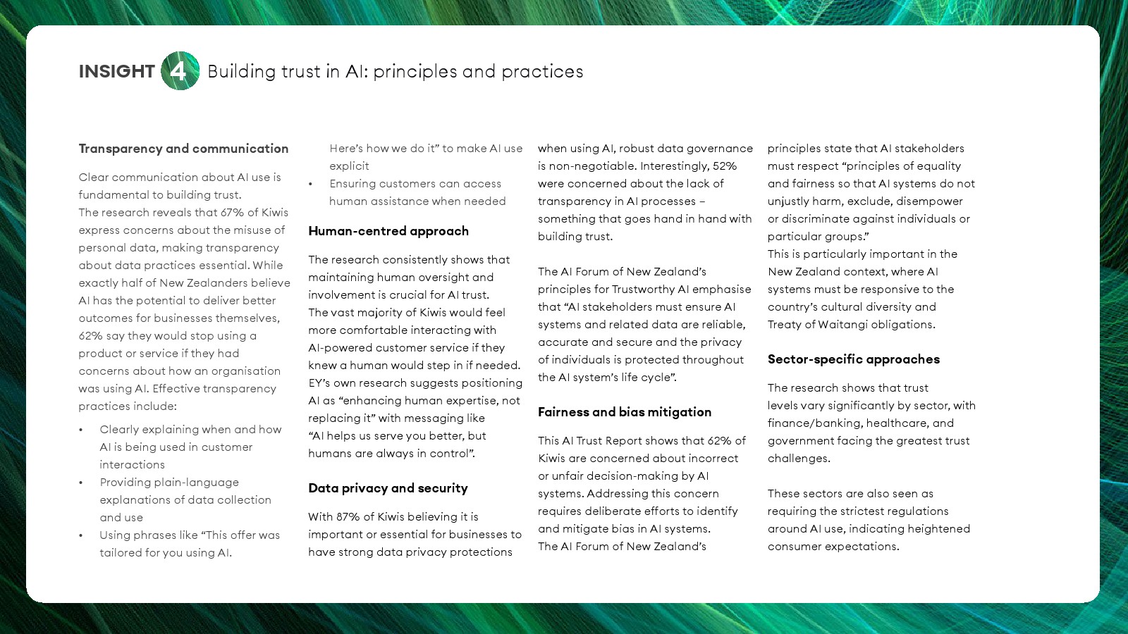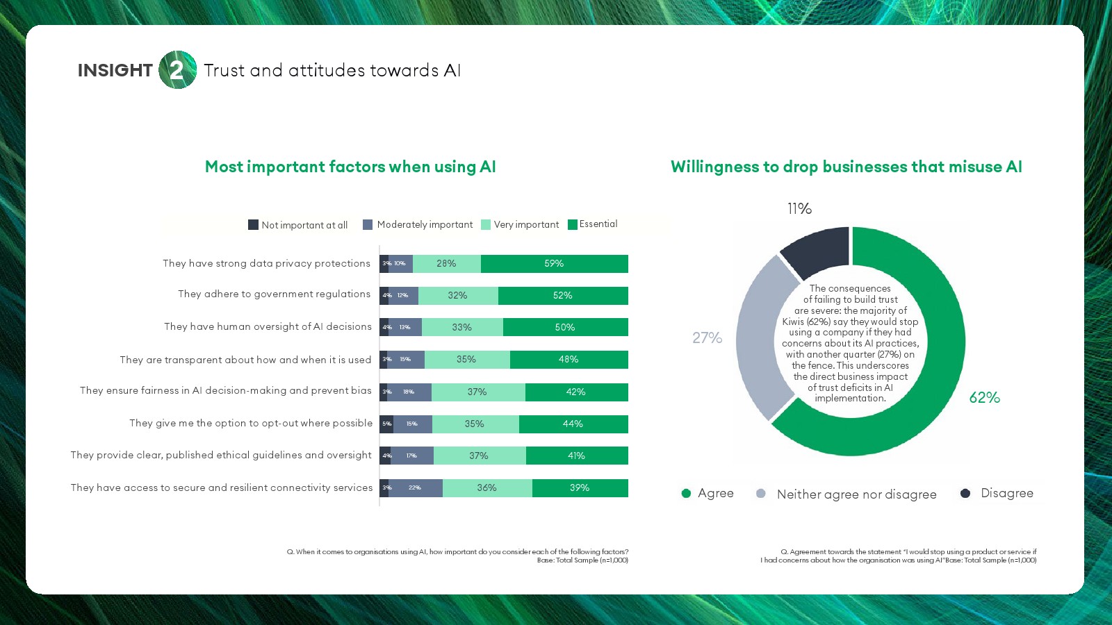 建立AI信任的关键因素呈现高度一致的共识。87%的新西兰人认为企业必须建立强有力的数据隐私保护机制。除隐私外,公众还高度重视政府监管、人类监督以及AI决策透明度。73%的受访者表示,如果企业提供明确的人工服务选项,他们将更愿意接受AI服务。71%的受访者认为AI系统必须存在可验证的人类监管。这意味着“人机协同”而非完全自动化,是公众接受AI的核心条件。