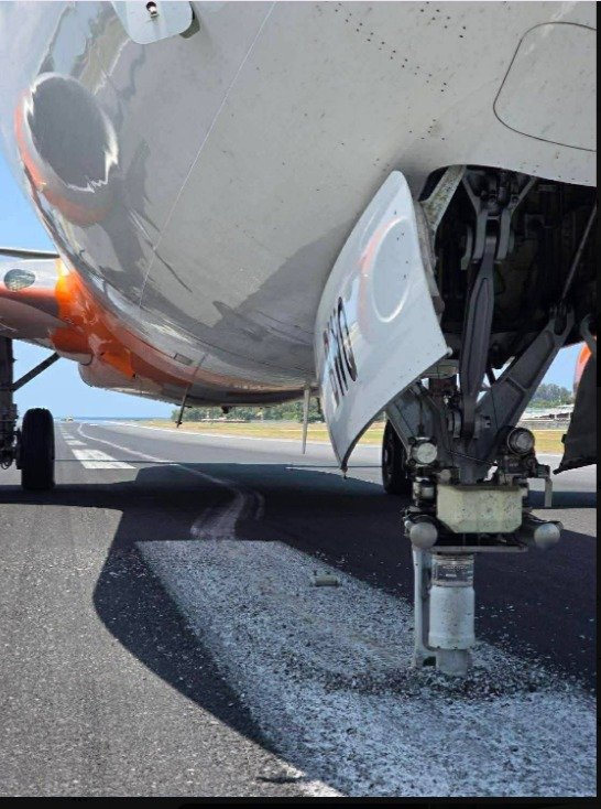 报道称,这架从客机在硬着陆后弹跳了一次,第二次接触跑道时,两个前轮脱落,前起落架与机场跑道直接接触,滑行数百米后,飞机随后卡在跑道上。
