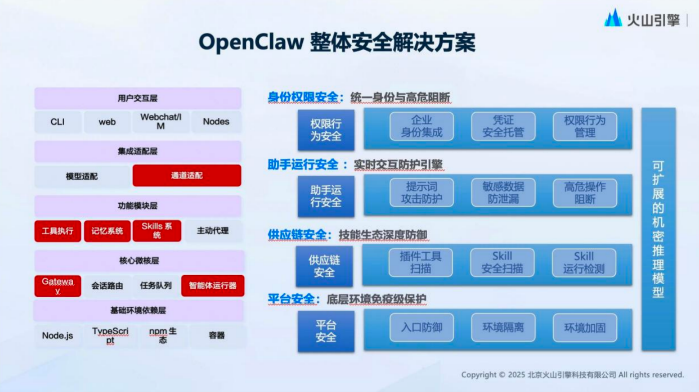 不只是火山引擎,此前腾讯、百度、智谱等多家厂商在发布国产龙虾产品的同时,同步匹配安全防护动作,相关方案均针对OpenClaw最突出的公网暴露、默认配置脆弱、部署操作不当引发的风险施策,通过权限管控、访问限制等方式,约束OpenClaw的系统调用能力,从源头规避权限过大导致的恶意操作、数据泄露问题。