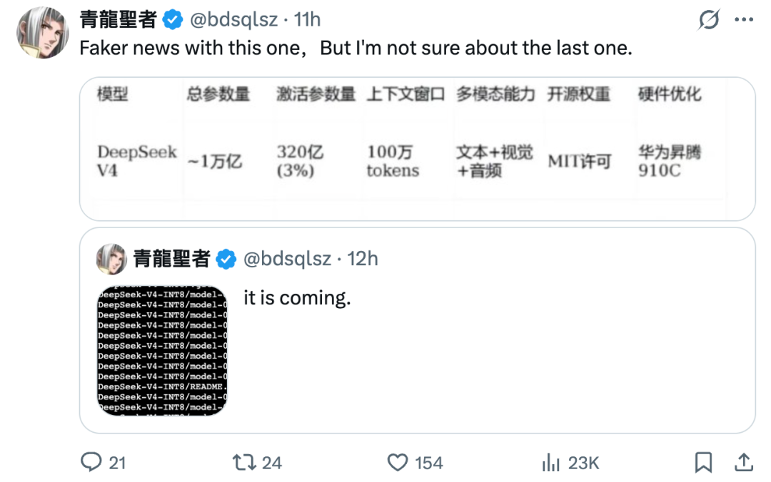 昨天晚上,推特博主「青龍聖者」发了一张截图,似乎「预示」了 DeepSeek V4 马上要来。