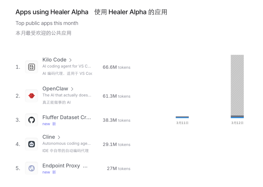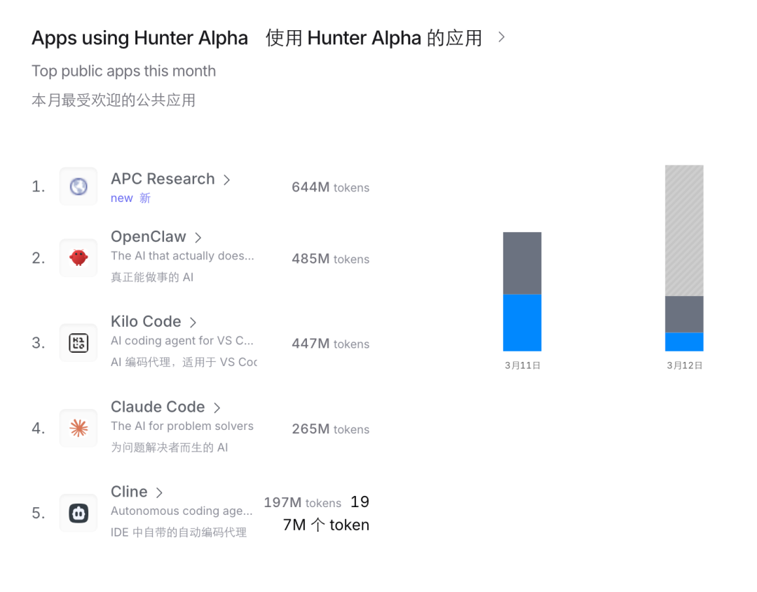 其中,「Hunter Alpha」还专门强调,它具有 OpenClaw 等「龙虾」框架所需的可靠性和指令遵循精度。OpenRouter 的统计也显示,不少用户已经用这两个模型在跑「龙虾」了。