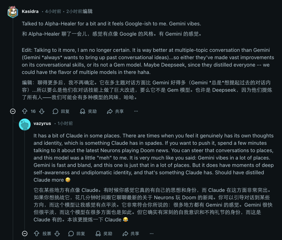 有人从对话风格入手,说 Healer Alpha 用起来有 Gemini 的「Google 味」,但也有人说它某些方面像 Claude。