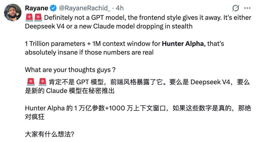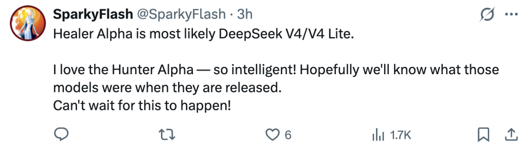 还有人猜测它们是两款中国模型,其中 Healer Alpha 很可能是 DeepSeek V4 或 V4 Lite。