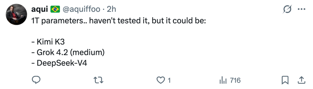 对于 1T 参数版本的 Hunter Alpha,猜测对象更多了,除了 DeepSeek V4,还有 Kimi K3、Grok 4.2、Claude 以及 GPT 5o 或 5.5 instant。毕竟,这么大的参数量和上下文组合,目前看来只有几家大厂能做到。