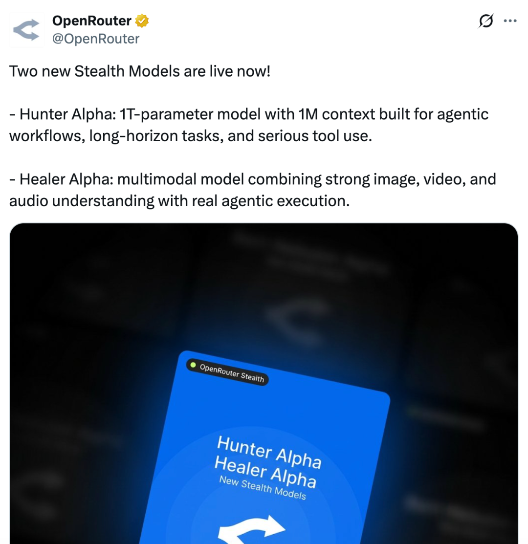 而就在今天早上,全球知名大模型聚合平台 OpenRouter 突然上新了两个神秘模型,分别是 「Hunter Alpha」 和 「Healer Alpha」 。