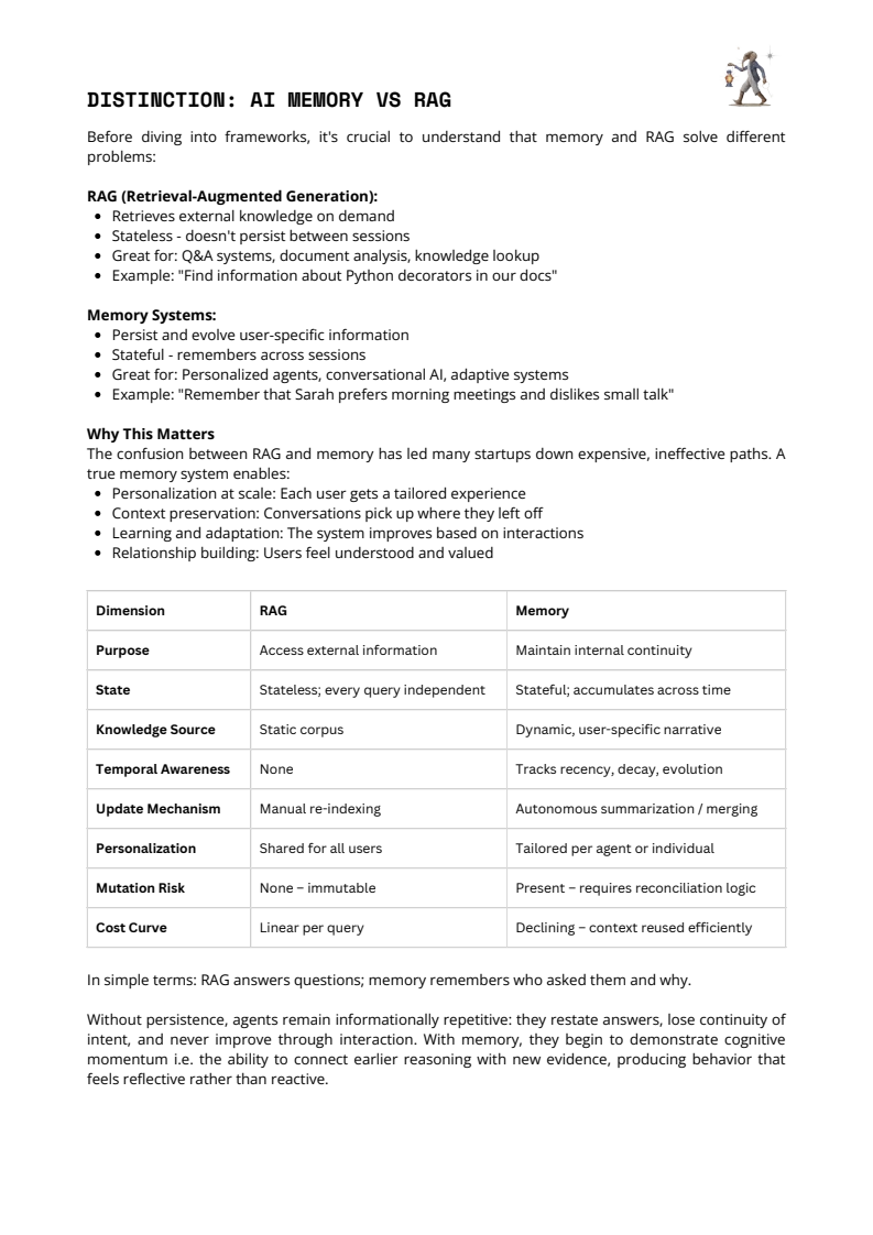 报告明确区分了“记忆”与 RAG。RAG 的本质是按需检索外部静态知识,天然无状态,适合问答与文档查询;而记忆系统强调跨会话的状态积累,记录用户偏好、历史决策与关系演化。在关键维度上,记忆具备时间感、可衰减、可合并与可遗忘特征,边际成本随复用而下降。实践表明,缺乏记忆的 Agent 行为是“反应式”的,而引入记忆后,系统开始呈现“认知动量”,能够将早期判断与新证据连接,显著提升长期决策质量。
