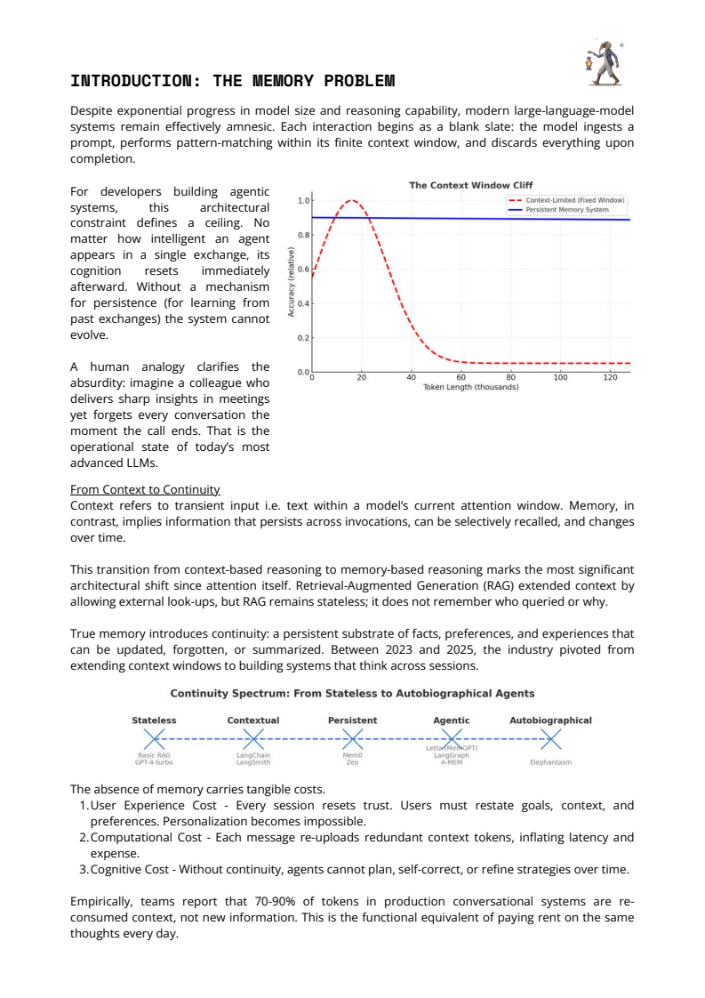2025年,AI Agent 的核心瓶颈已不再是模型规模,而是“记忆能力”。报告指出,当前主流大模型在架构上依然是“健忘的”,每一次对话结束即清空上下文,导致70%—90%的推理 token 被反复用于重传历史信息,既推高算力成本,也破坏用户连续体验。记忆缺失直接带来三类成本:用户需反复重申目标,个性化无法累积;系统重复计算,延迟与费用上升;Agent 无法跨时间规划、自我修正或学习。这一问题已成为制约 Agent 从“聊天工具”走向“行动系统”的硬性天花板。