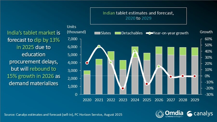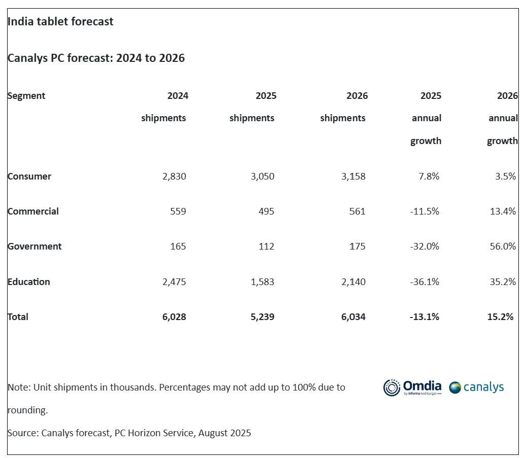 2025年第二季度,印度平板电脑市场同比萎缩27%,出货量降至120万台。下降的原因是商业发货量下降了64%,政府和教育部门的订单在去年的强劲采购后有所放缓。相比之下,由于在线促销、价格合理的设备以及对娱乐和家庭学习用例的需求不断增长,消费者群体增长了35%。然而,市场继续面临入门级饱和、廉价笔记本电脑和大屏幕智能手机竞争加剧的压力,高端和教育平板电脑成为唯一的亮点。