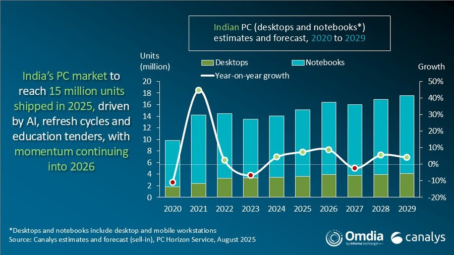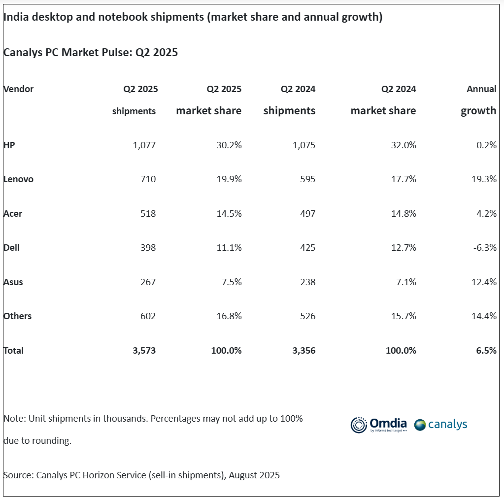 根据Canalys(隶属于Omdia)的数据,印度个人电脑市场(不包括平板电脑)在2025年第二季度同比增长6%,达到360万台。在强劲的企业和支持人工智能的设备的推动下,笔记本电脑出货量增长8%,达到270万台。台式机出货量保持稳定,小幅增长1%,至86.1万台。不过,由于政府采购力度减弱,平板电脑市场大幅下滑27%,至120万台。
