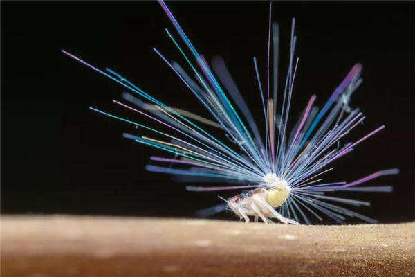 而广翅蜡蝉科若虫的蜡形态风格更硬朗一些,大多只位于背腹部,量少,蜡丝根根分明且比较长,呈现独特的束状或者扇形。