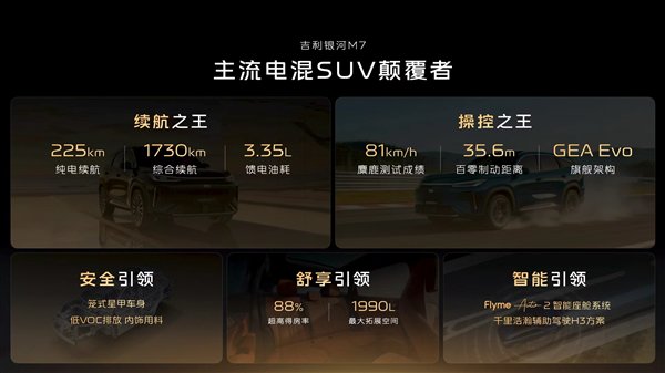 动力方面,新车采用插混系统,发采用1.5L雷神EM超级电混发动机,最大功率82kW,全系搭载神盾金砖电池,银河M7配备了18.4kWh和29.8kWh两种容量,最大CLTC纯电续航225km,CLTC综合续航1730km,在同级处于领先地位。