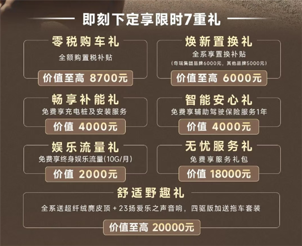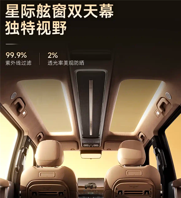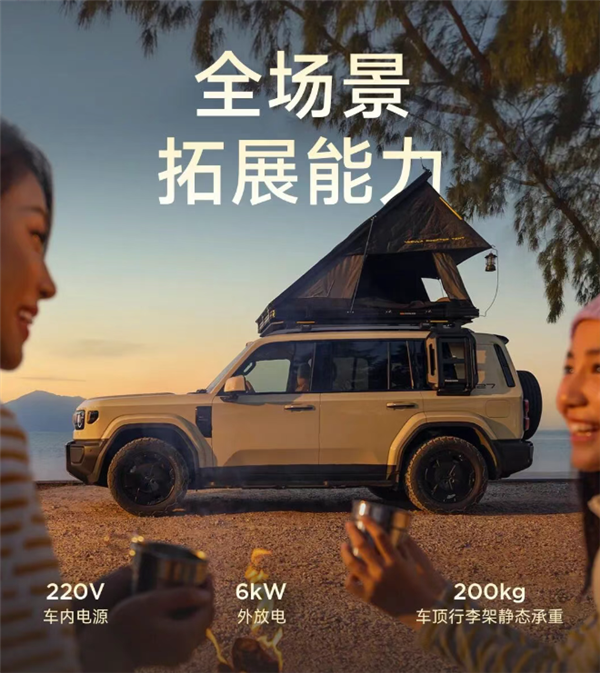 尤为值得一提的是,V27全车设有17处51个生态接口,支持灯光、支架、电源等改装,同时还拥有200kg车顶静态承重+1.6T拖挂资质,可安装车顶帐篷、拖挂房车,并提供220V电源+6kW外放电功能,适配户外露营等多种场景。