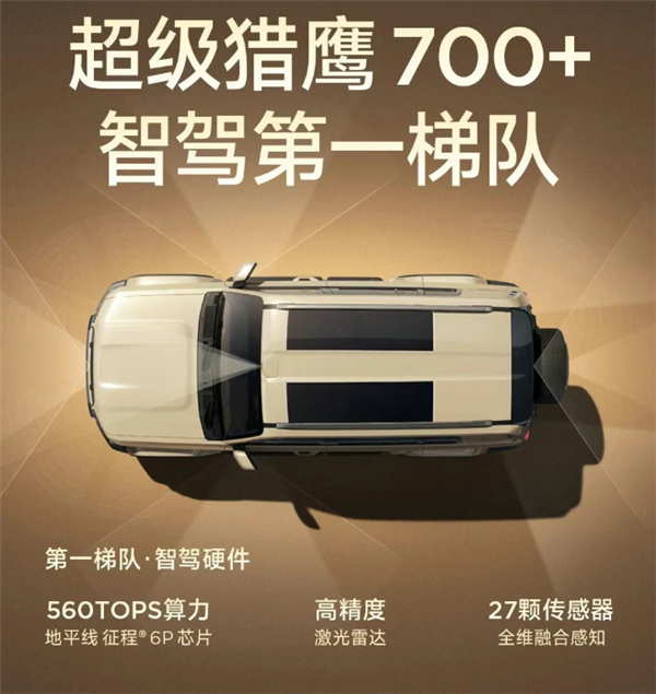 而顶配车型将搭载超级猎鹰700+,增加车顶激光雷达,同时换装地平线征程6P驾驶芯片,算力达560TOPS,可实现车位到车位领航、城市导航辅助驾驶和高速导航辅助驾驶等。