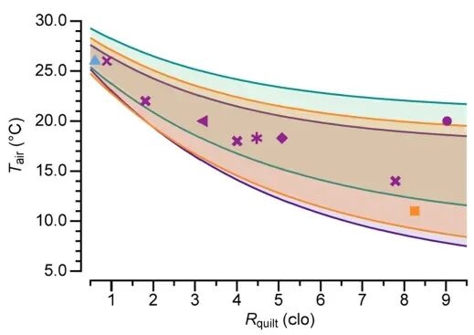 上图展示了不同材质被子在不同室温下的热舒适区域,X轴表示被子保温值(Rquilt, clo),Y轴表示空气温度(Tair, ℃)。不同颜色的曲线代表不同材质被子的舒适边界——曲线上方区域过热,下方过冷。紫色线条为聚酯纤维被,保温值范围最宽,但舒适温度随保温值增加下降最快。青色为丝绸被,舒适温度最高,曲线最平缓。橙色为羽绒被,保温效率最高,舒适温度下降较缓。