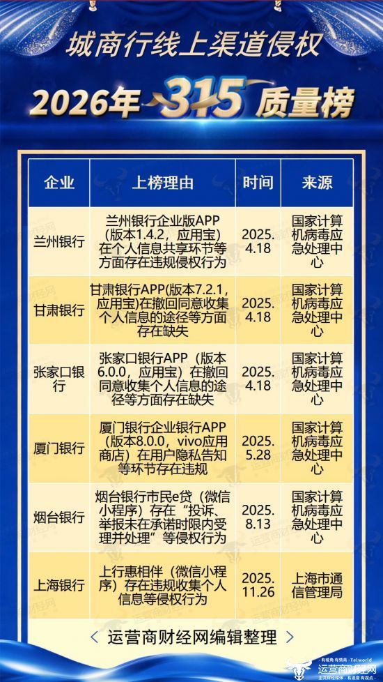 其中,兰州银行企业版APP(版本1.4.2,应用宝平台)被指在个人信息共享环节等方面存在违规侵权;