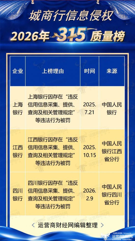 从榜单来看,2025年到2026年2月,先后有上海银行、江西银行、四川银行,三家城商行因“违反信用信息采集、提供、查询及相关管理规定”被央行及其分支机构处罚,反映出地方性银行在个人信息保护方面仍存在明显的制度漏洞和执行短板。