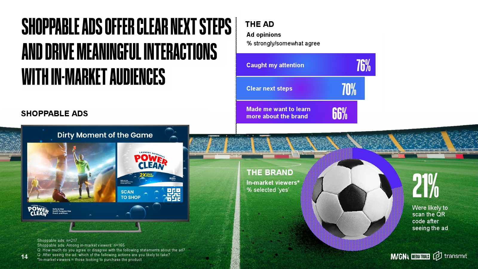 在转化层面,互动式广告形式开始展现潜力。在可购物广告测试中,76%的观众表示广告能够吸引注意力,70%的观众认为广告提供了清晰的下一步行动路径。66%的观众表示广告激发了他们进一步了解品牌的兴趣。在有明确购买需求的观众群体中,21%表示在看到广告后愿意扫描二维码进行进一步行动。