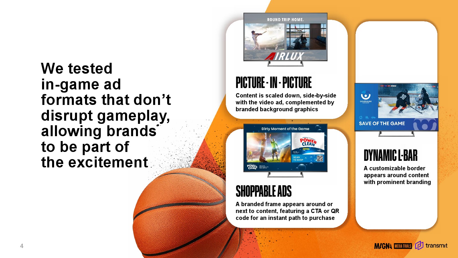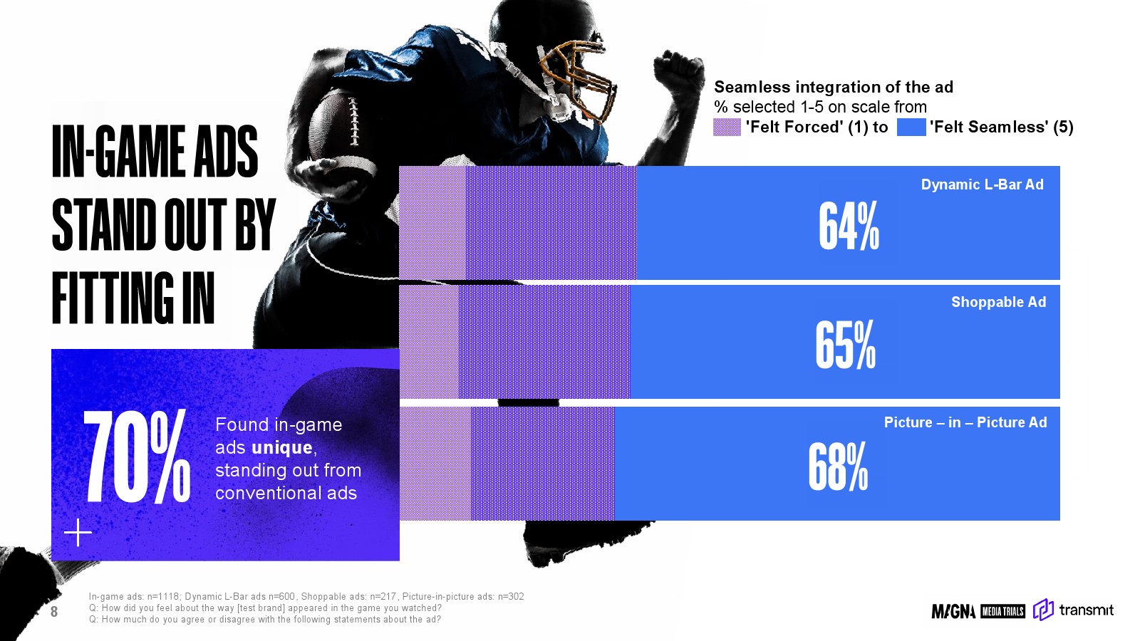 在整体样本中,约70%的观众认为赛事内广告具有“独特性”,能够在众多广告形式中脱颖而出。其中,画中画广告、动态L-Bar广告与可购物广告的“自然融合感”评价分别达到68%、64%与65%。