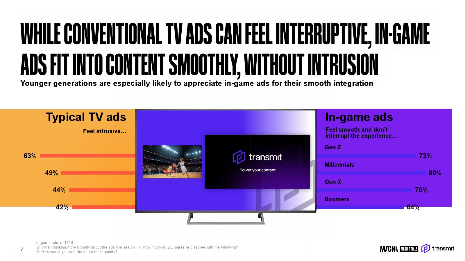 研究结果显示,与传统电视广告相比,嵌入式赛事广告明显降低了观众的“打断感”。63%的Z世代认为传统电视广告具有明显干扰性,而73%的Z世代认为赛事内广告更加自然顺畅。在千禧一代中,这一差距更为明显,49%认为传统广告干扰体验,而80%认为赛事内广告与内容融合度更高。