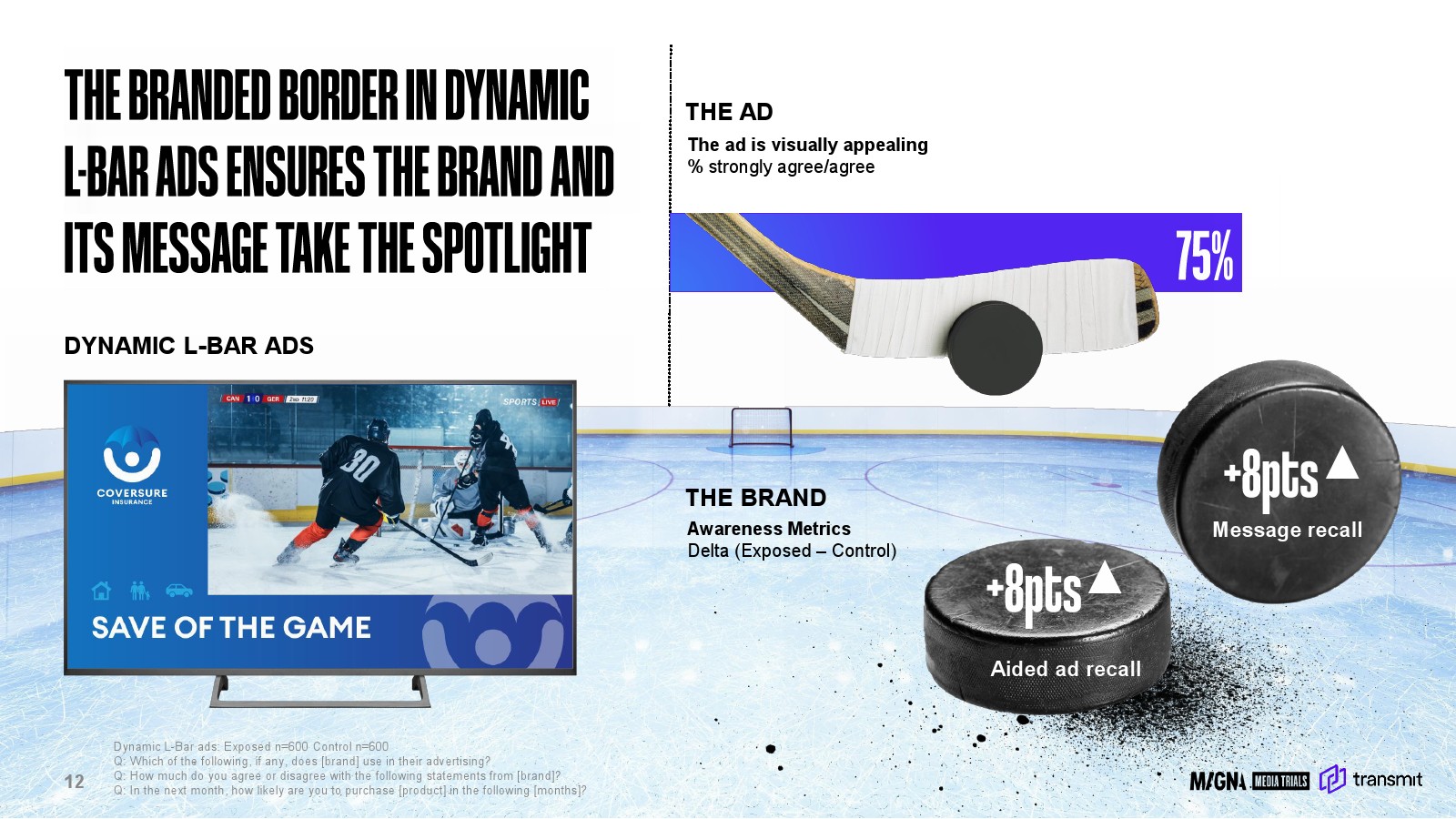 品牌记忆度的提升是赛事内广告最直接的商业价值。实验数据显示,在三组品牌测试中,广告曝光组的辅助广告记忆率分别比对照组提升31%、39%与38%。动态L-Bar广告能够显著提升品牌信息可见度,品牌辅助记忆度提升8个百分点,同时信息记忆度同步提升8个百分点。