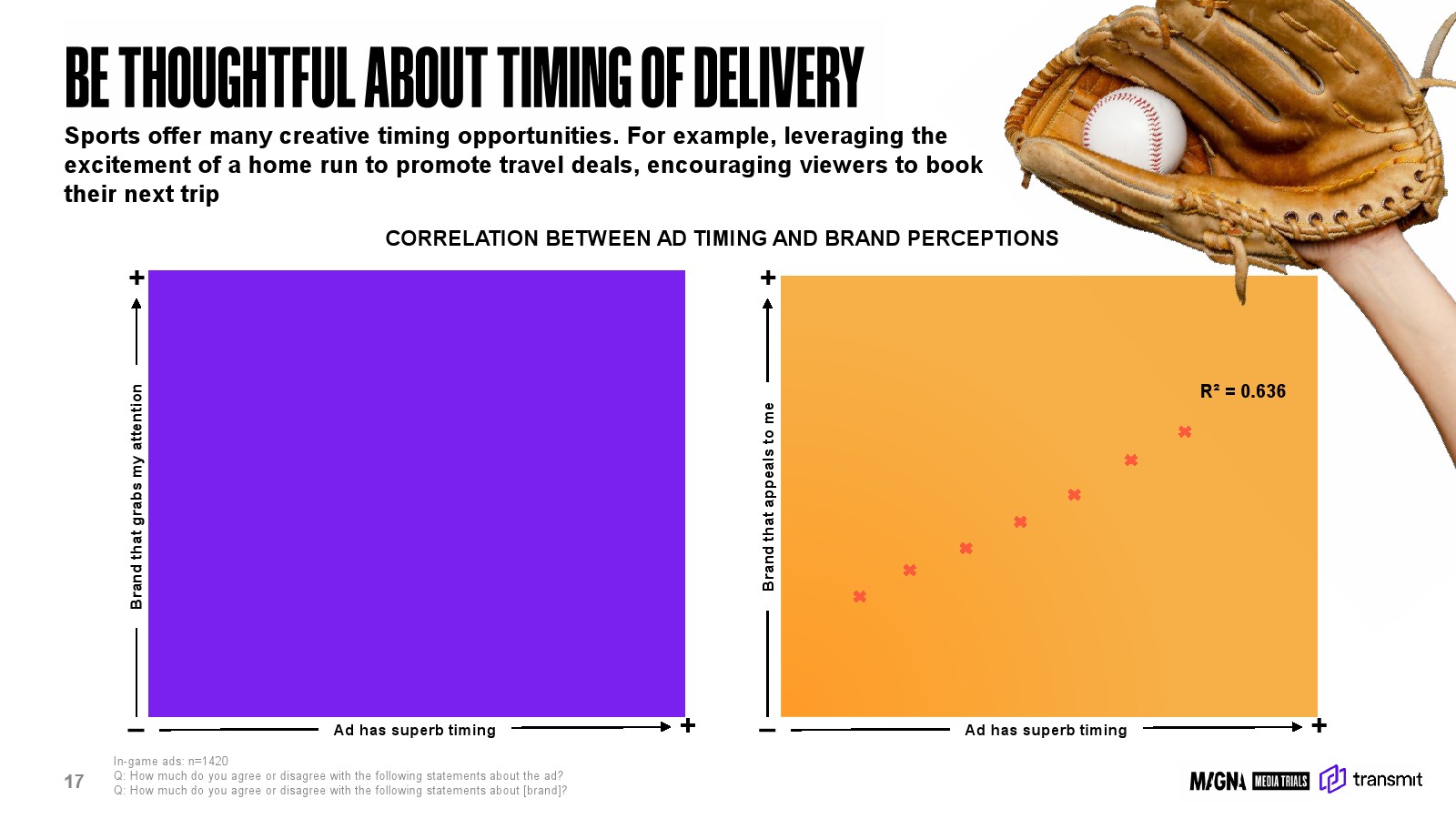 同时,广告投放时机与品牌感知之间呈现较高相关性,广告时机与“品牌吸引力”的相关系数R²达到0.628,与“品牌好感度”的相关系数达到0.636。