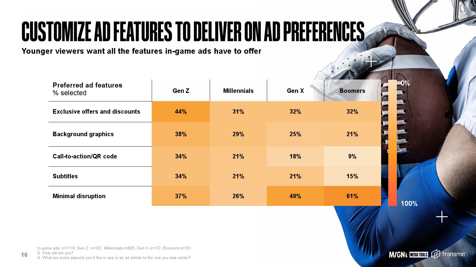 值得注意的是,赛事内广告仍处于早期渗透阶段。仅49%的观众表示此前曾见过类似广告形式,这意味着市场仍具有较高的新鲜感红利。年轻观众对广告功能化需求更高,例如44%的Z世代希望看到独家优惠,38%希望加入背景图形元素,34%希望出现二维码或行动按钮。