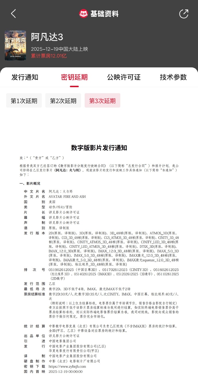 IT之家 3 月 16 日消息,据猫眼专业版显示,电影《阿凡达 3》第三次密钥延期,延长上映至 2026 年 4 月 18 日,截至当前累计票房已超 12.01 亿。