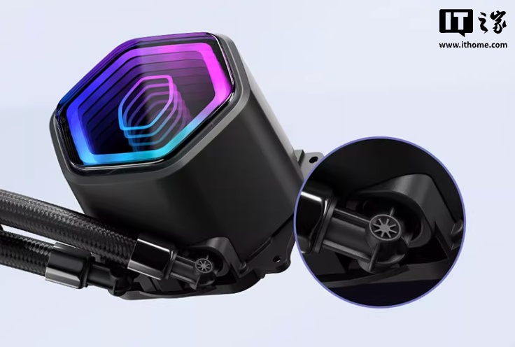 系列散热器兼容英特尔的 LGA 1851/1700 以及 AMD 的 AM 5/4 平台。其配备 4 根 6mm 热管,水泵使用双腔体结构,冷头采用“无限镜”设计。