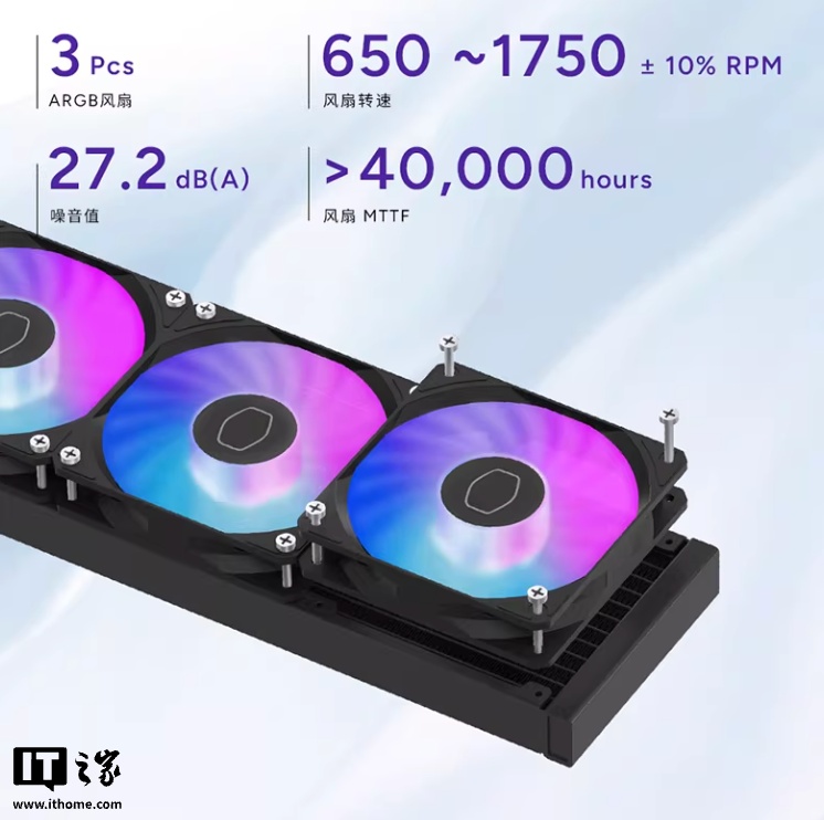 系列散热器标配 12025 规格液压轴承风扇,最高转速可达 1750±10% RPM,最大风量静压分别为 71.9 CFM 和 1.86mmH2O,噪音值≤27.2 分贝。