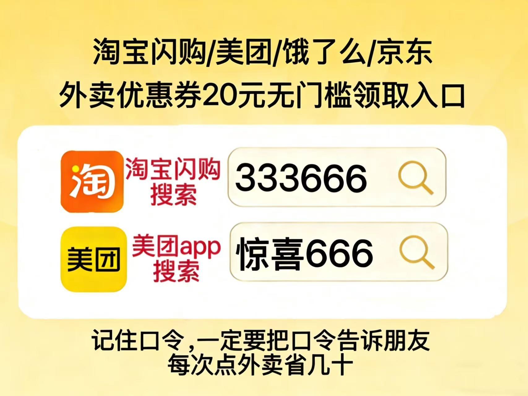 美团 APP 搜【惊喜666】【惊喜333】,每日可领大额神券;