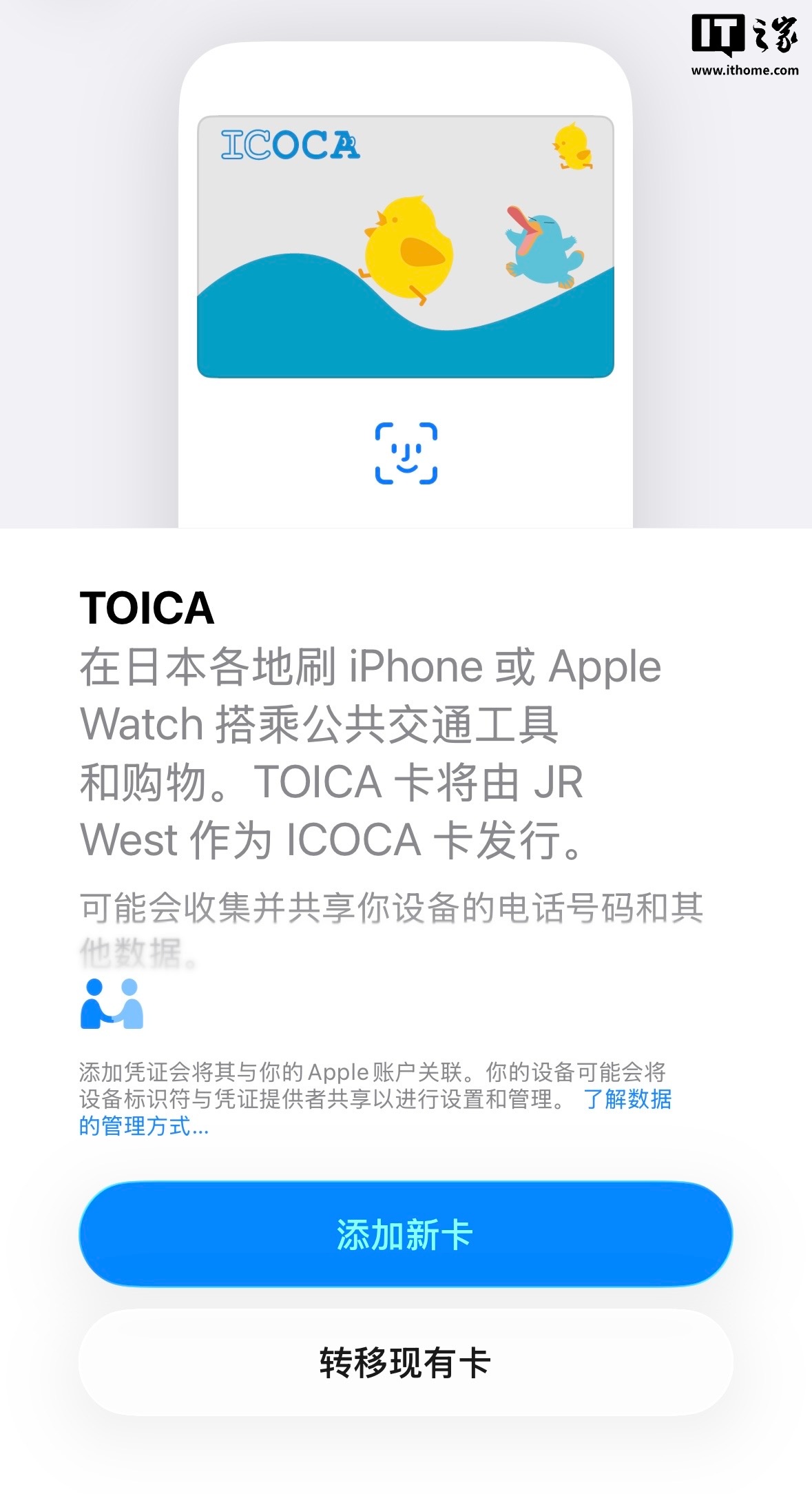 IT之家 3 月 17 日消息,苹果现已在其钱包(Apple Wallet)中新增一张 TOICA 交通卡,该卡系基于 JR 西日本的 ICOCA 交通卡体系打造,由 JR 西日本负责发行,卡内余额亦由其统一管理,用户可以直接在钱包中开卡,或将现有 TOICA 实体卡或定期票信息迁移至该虚拟卡。