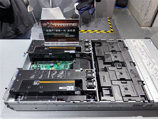 全国产渲染推理一体的服务器,海光C86 7385处理器搭配砺算两块LX ULTRA显卡。