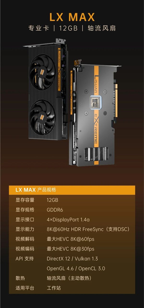 砺算科技还宣布,游戏卡LX 7G100将于618期间在京东首发上市,三款专业卡LX MAX、LX PRO、LX ULTRA将从3月17日起接受客户预定。