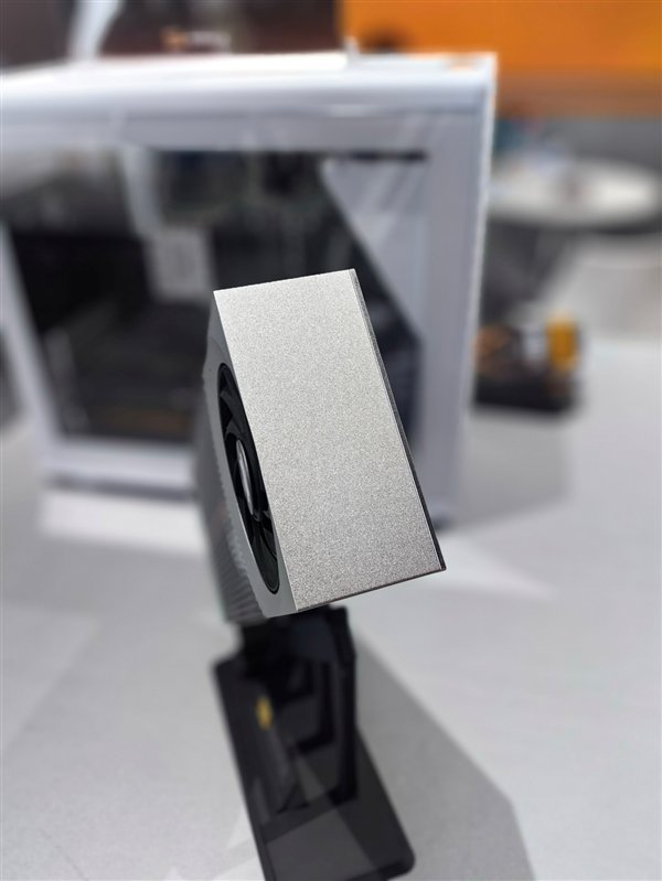 它采用亮眼的银色外观,造型凌厉,正面三个轴流风扇,两侧的较大而中央的较小,左边两个隐藏在内部若隐若现,顶部还有一个RGB灯。