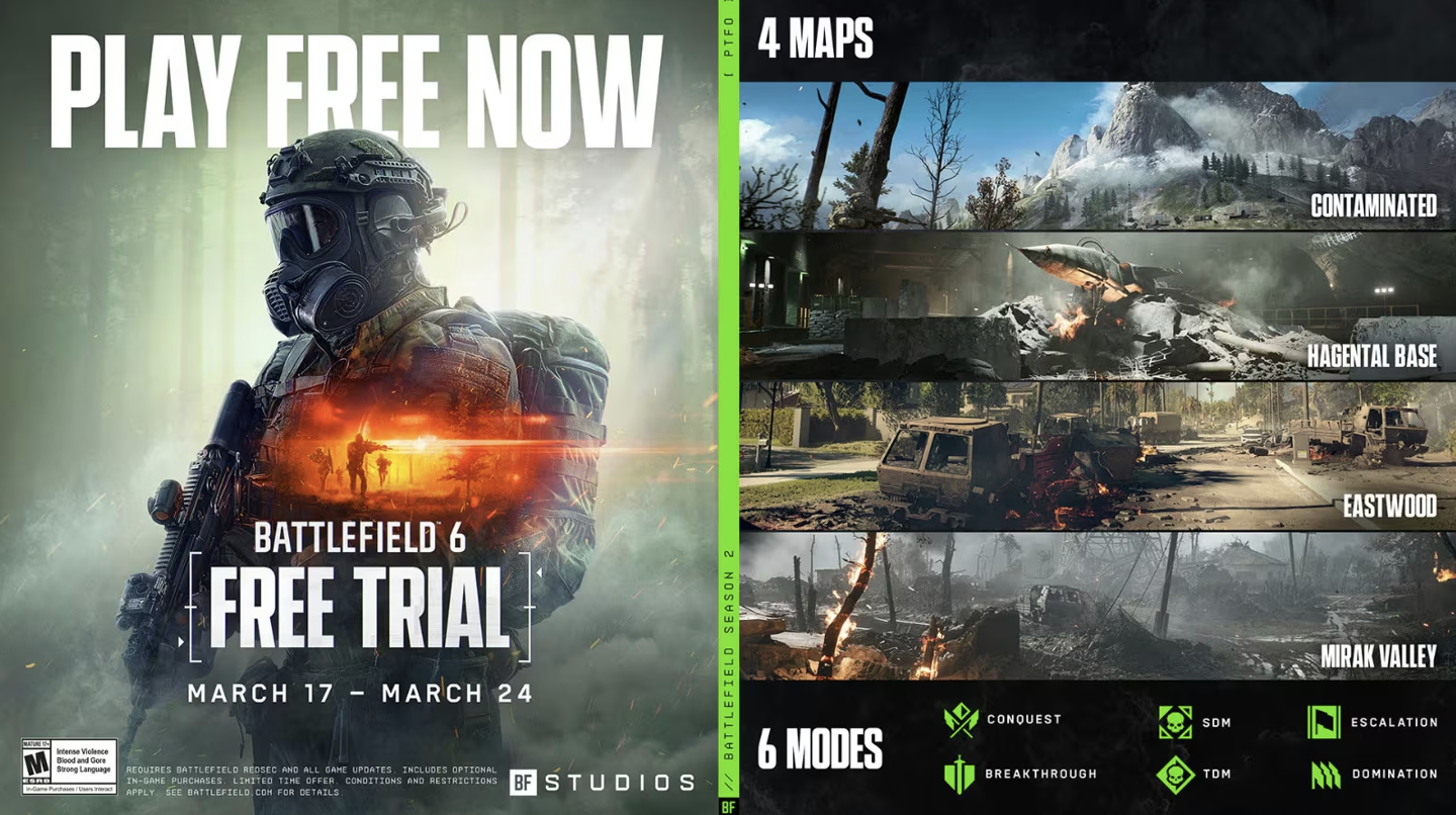 IT之家 3 月 17 日消息,EA 旗下《战地风云 6(Battlefield 6)》从北京时间 2026 年 3 月 17 日(今天)起至 24 日开启限时免费试玩,提供六种模式(征服 / 升级 / 突破 / 小队死斗 / 团队死斗 / 抢攻)、四张地图(污染 / 哈根塔尔基地 / 东方木林 / 米拉克山谷),可选三种游玩列表(夜幕降临 / 全面战争 / 休闲突破)。