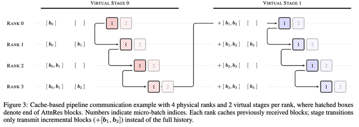 训练端设计了跨阶段缓存机制,在流水线并行训练中每次切换阶段时只传输新增的那一小部分块数据,而不是每次都把全部历史重新传一遍,实测整体训练额外开销不超过 4%。