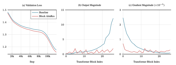 从训练过程来看,基线模型的各层输出数值随深度单调增大,印证了 PreNorm 稀释问题;而 AttnRes 的各层输出数值在块边界处得到重置,呈现周期性变化,各层梯度分布也更加均匀,说明更多的层真正参与到了有效的学习中。