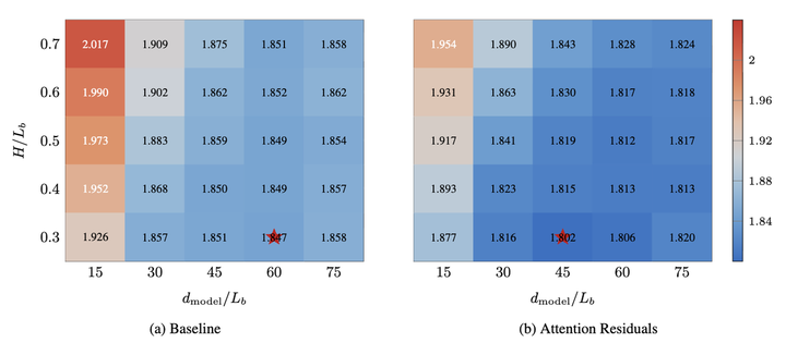 AttnRes还带来了一个对未来模型设计有参考价值的发现。研究人员在固定总计算量和参数量的前提下,枚举了 25 种不同的深度与宽度组合,对比基线模型和 AttnRes 各自偏好的最优架构。