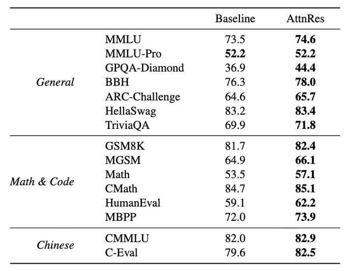在 48B 参数(3B 激活)规模的 Kimi Linear 架构实验中,Block AttnRes 展现了极强的泛化性:在全部 15 项主流评测基准中,其表现均持平或优于 PreNorm 基线模型。