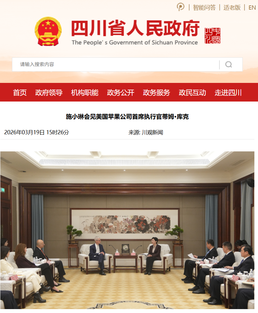 IT之家 3 月 19 日消息,据四川省人民政府官网今日消息,3 月 19 日,四川省委副书记、省长施小琳在成都会见美国苹果公司首席执行官蒂姆 · 库克一行。