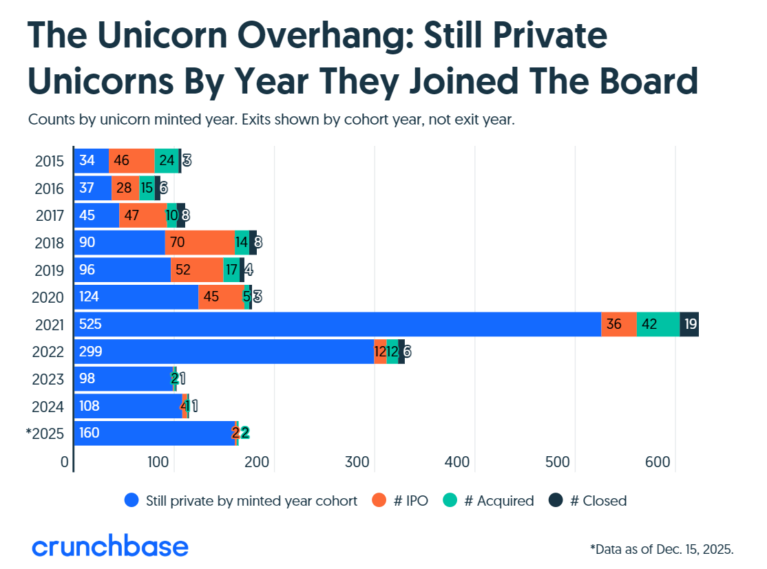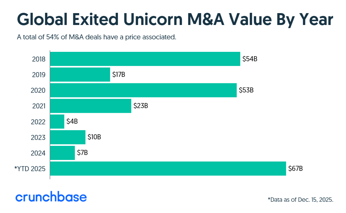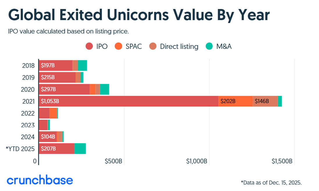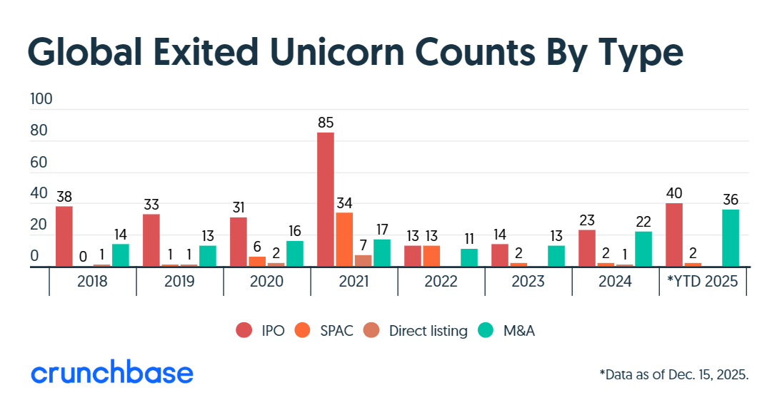 根据Crunchbase的数据分析,在经历了三年的低迷后,独角兽公司的退出活动终于在2025年回暖。独角兽公司的首次公开募股数量已回升至2021年之前的水平,而并购交易在数量和金额上均创下历史新高。