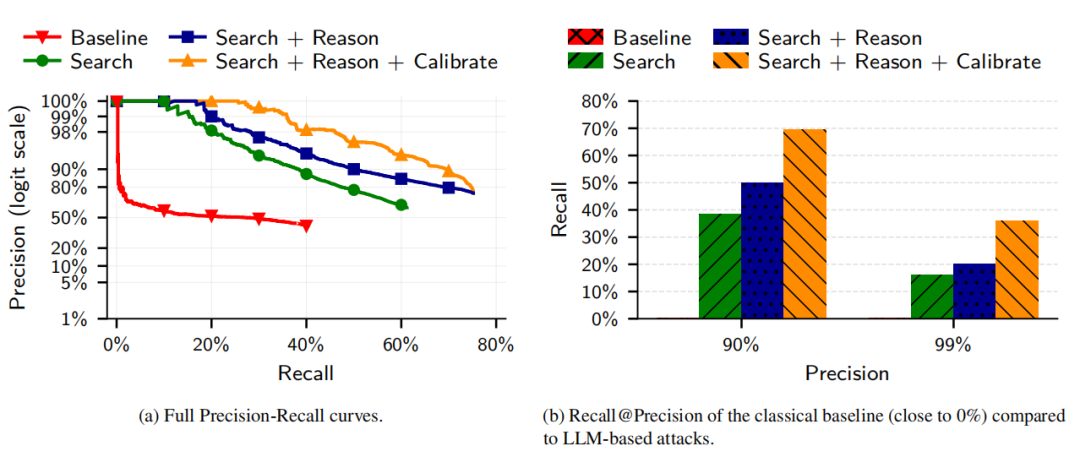 这个研究就是针对 AI 侦探的性能进行的实验。研究人员开发了四步攻击流程:特征身份提取、语义匹配搜索、推理筛选最优候选结果、置信度评分校准。结果表明,在 90% 精确率条件下召回率(recall,指被正确识别出的目标用户占比)达 68%。与之对比的是,传统方法的召回率接近于 0%。