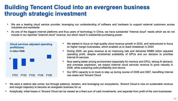 而在腾讯云这边,全年金融科技及企业服务收入 2294 亿元,同比增长 8%,表面上看似乎不算特别炸裂,但是Q4 单季同比就增长了 22%,2024年才刚刚盈亏平衡的腾讯云,2025年直接干出了50亿的调整后经营利润。