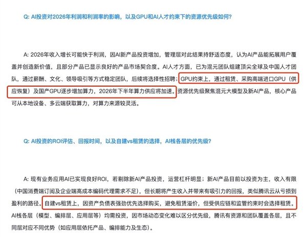 先把有限的算力优先投向广告推荐、游戏提效、视频号分发、云上 AI 工作负载这些能尽快听到金币声的地方,而不是去跟OpenAI拼一把。