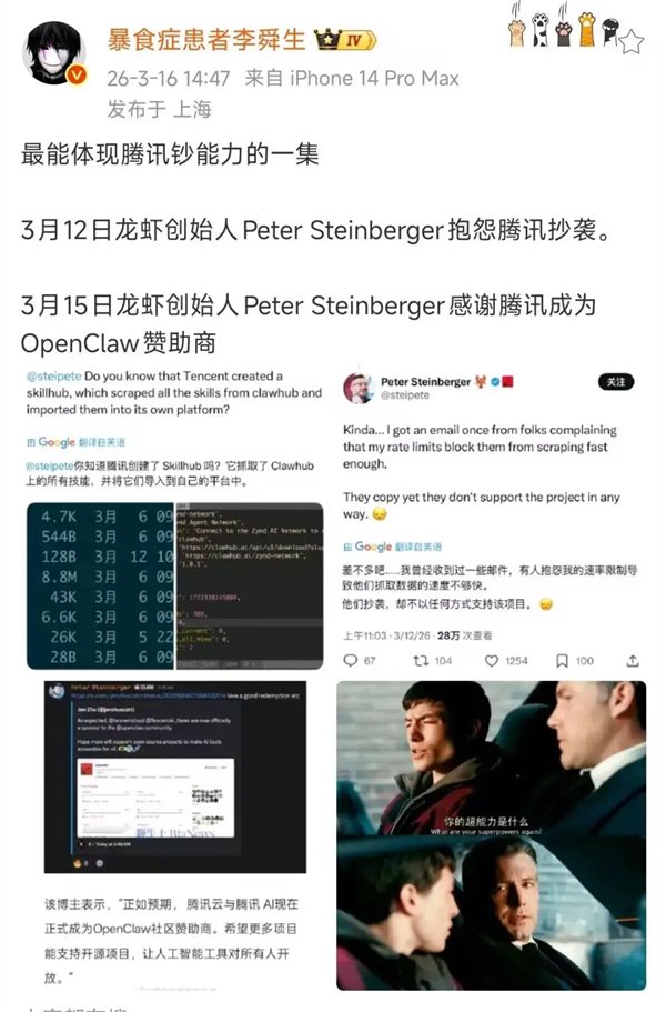 也许是跟大家刻板印象有关,再加上刚经历了春节期间元宝红包,这几天自打出了 Openclaw 开发者光速变脸的事,更是加深了大家对腾子的钞能力标签。